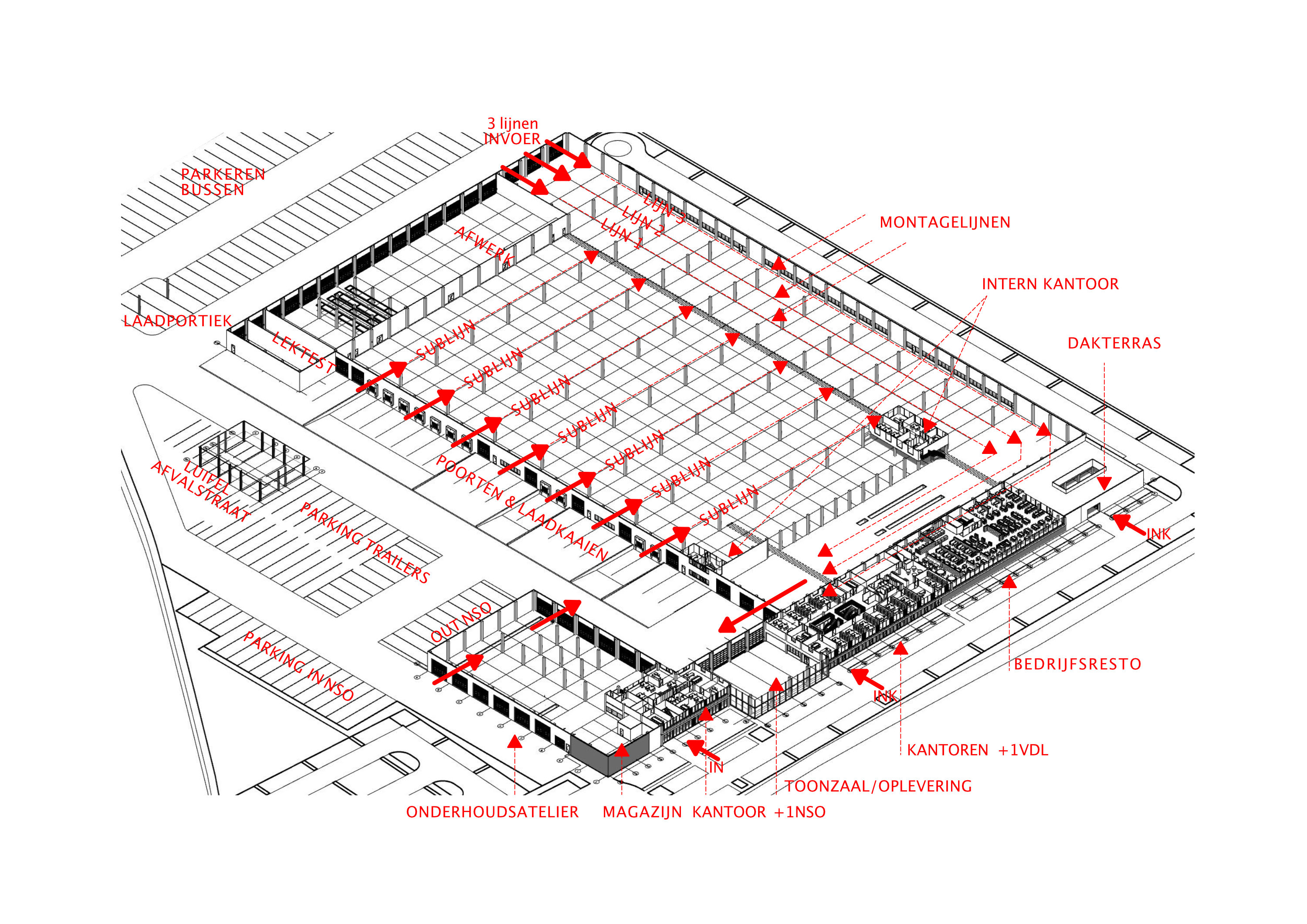 De productielijnen van het bedrijf vormen de basis van het ontwerp. Onze taak als architect was om dit te vertalen naar een economisch industrieel gebouw.
